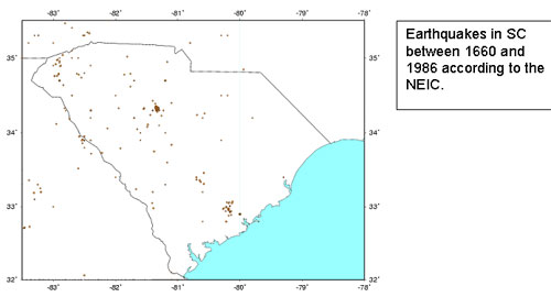 Seismically, South Carolina been active since the first settlers arrived as shown below on the map of earthquakes that occurred in South Carolina between 1660 and 1986, these earthquakes are based on personal accounts and evidence of damage as well as seismographs in the later years.