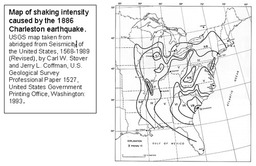However, Charleston is perhaps best known for the earthquake of 1886 which measured as a magnitude between a 6.9 and a 7.3 on the Richter scale and devastated Charleston and Summerville causing massive damage and more than 60 deaths. That earthquake was so large that it was strongly felt as far north as Chicago. The map below shows the “felt” areas for the Charleston earthquake as notations on the Mercalli magnitude scale.